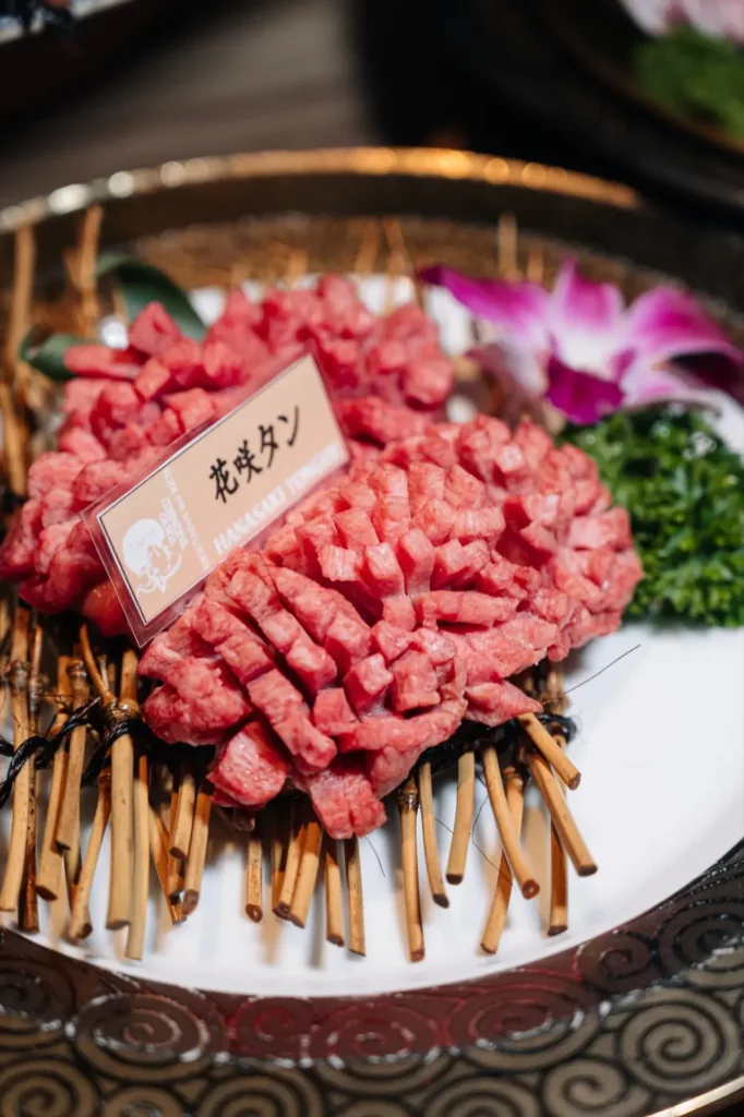 เมนูถัดมา เป็นเมนูที่ใครได้ลองทานจะต้องแสงออกปากกันเลยทีเดีย กับเมนู ลิ้นวัวบุปผาย่างเกลือ เสิร์ฟลิ้นวัวแบบบั้งเป็นลาย เพื่อให้ความร้อนจากการย่างบนเตาคลายเนื้อลิ้นวัวค่อย ๆ เป็น ลักษณะดอกไม้อย่างสวยงาม เมื่อสุกในระดับ Medium Rare เราจะยกมาทานคู่กับวาซาบิเพื่อเพิ่มทั้งรสชาติ และเนื้อสัมผัสที่มีความนุ่ม เด้ง แบบละลายในปาก และไม่เหนี่ยวจนเกินไป